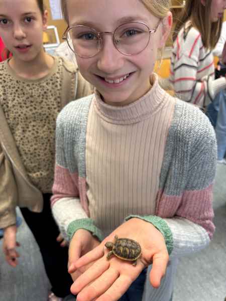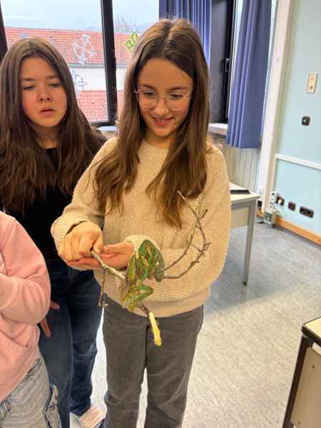 Ein weiteres Highlight waren kleine griechische Landschildkröten, bevor das Jemenchamäleon vorgestellt wurde. Hier konnten die Schülerinnen den typischen Klammergriff, den Rundumblick der Augen sowie die beeindruckende Schleuderzunge beobachten.