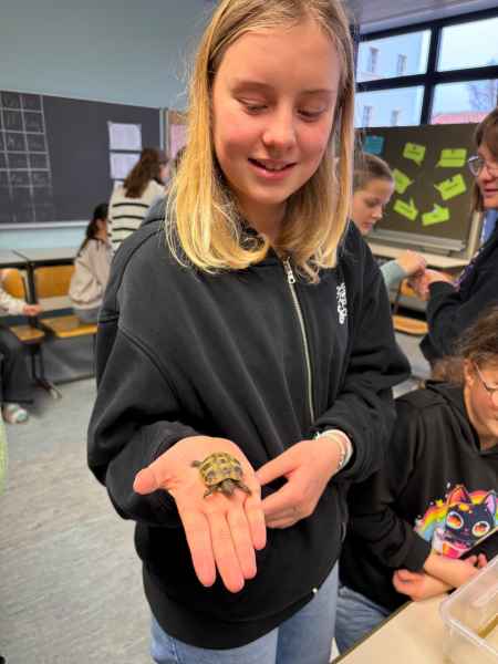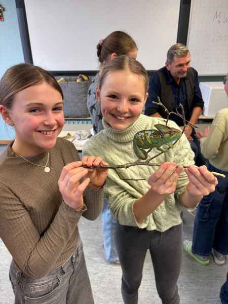 Ein weiteres Highlight waren kleine griechische Landschildkröten, bevor das Jemenchamäleon vorgestellt wurde. Hier konnten die Schülerinnen den typischen Klammergriff, den Rundumblick der Augen sowie die beeindruckende Schleuderzunge beobachten.