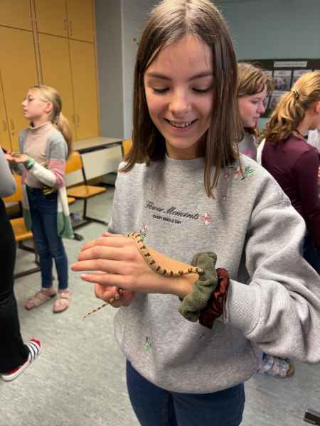 Während des Vortrags wies Herr Werdan immer wieder auf die anspruchsvolle Pflege und artgerechte Haltung der Tiere hin. Zum Abschluss hatten alle die Möglichkeit, ausgewählte Tiere vorsichtig auf die Hand zu nehmen. Dabei wurden Berührungsängste schnell abgebaut und ein nachhaltiges, hautnahes Naturerlebnis geschaffen.