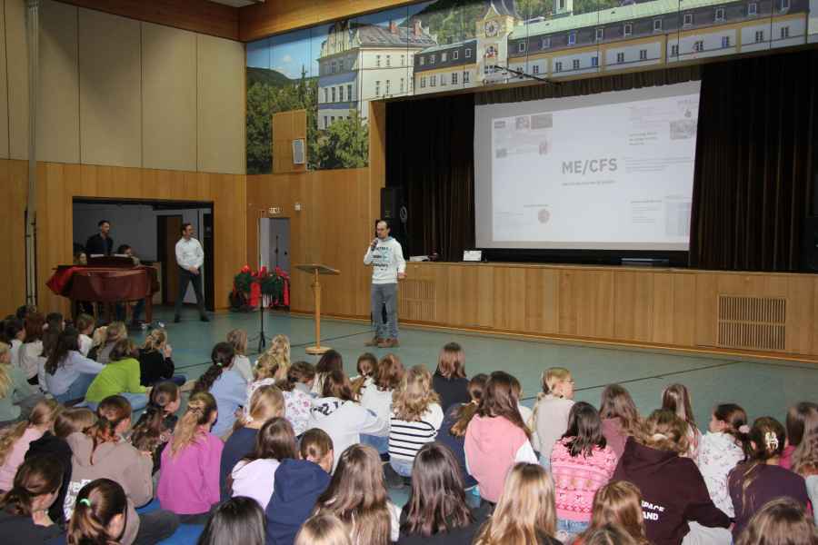 Zur Spendenübergabe kam Nadines Verlobter Christoph Geitner an die Schule, wo er im Anschluss an eine Adventsandacht die versammelte Schulgemeinschaft in Form eines Vortrags über die Krankheit ME/CFS informierte und zugleich Nadines Schicksal genauer beleuchtete.